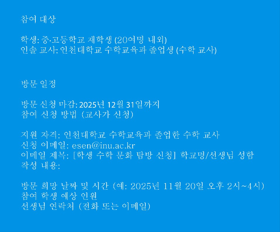 [학사] 인천대 수학교육과 커리업 프로그램-수학 문화 탐방 지역 학생 학과 방문