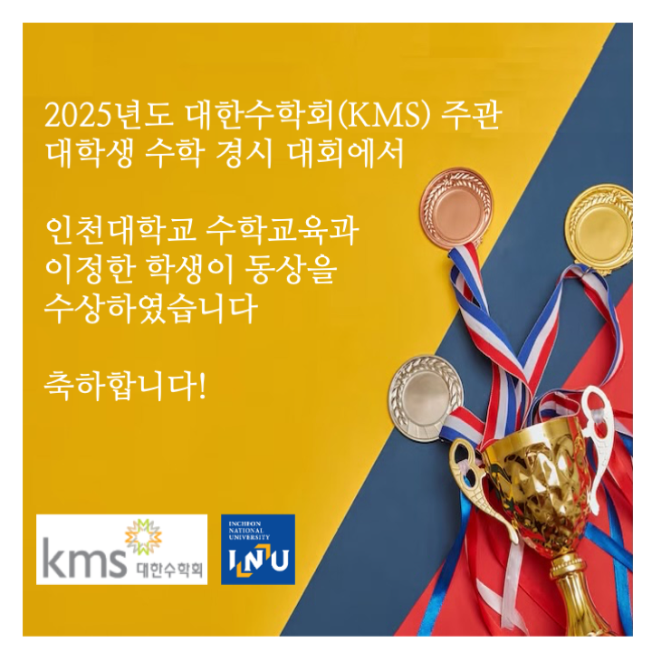 2025년 대한수학회 주관 대학생 수학 경시 대회에서 우리과 1학년 이정한 학생이 동상을 수상하였습니다.