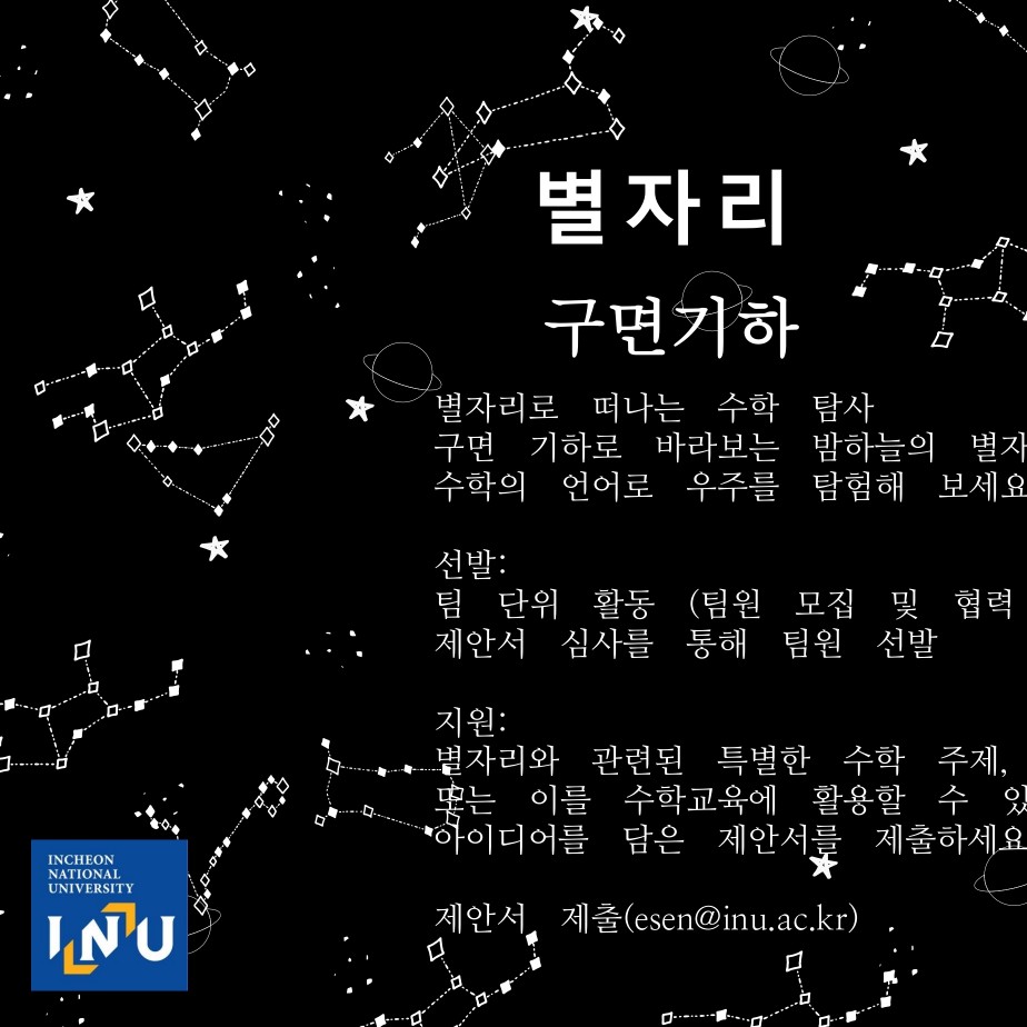 fnctId=bbs,fnctNo=1088 [학사] 별자리로 떠나는 수학 탐사 글번호 413532 작성일 2025-10-03 수정일 2025-10-03 작성자 수학교육과 (032-835-8824) 조회수 44 첨부파일 첨부파일이(가) 없습니다. 다음글 [학사] 2026년 2월 졸업 예정자 교원자격증 취득 예정 증명서 발급 신청 안내 박진우 2025-10-13 09:28:49.0 이전글 [학사] 2026학년도 1학기 학교현장실습 안내 박진우 2025-09-24 14:31:52.0 목록